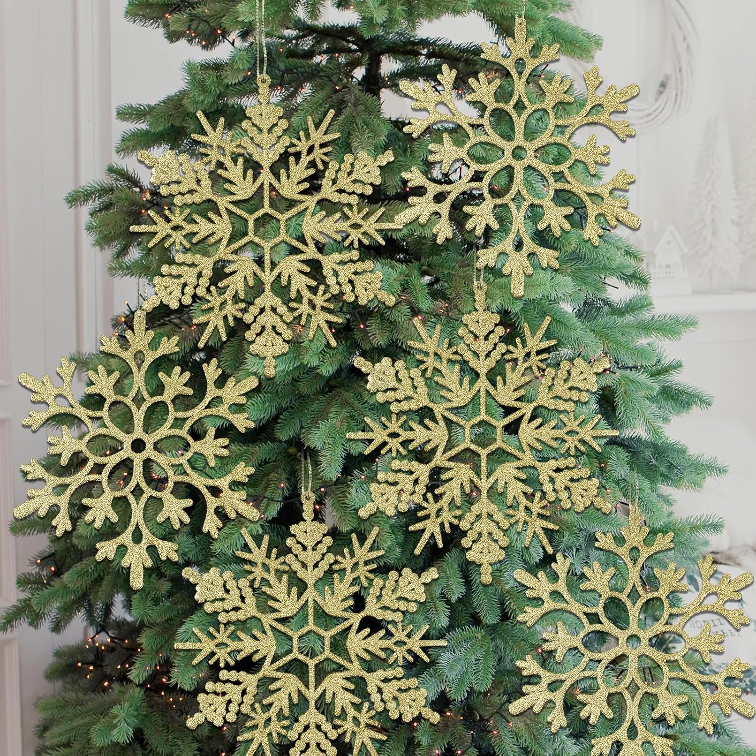 - Designed for Hanging: Each gold glitter snowflakes tree ornaments features a pre-drilled hole at the top, specially designed for Christmas hanging decoration. Simply use the included rope to hang them effortlessly on Christmas trees, walls, ceilings, windows, fireplaces, porches, mantels, doors, bedrooms, and more