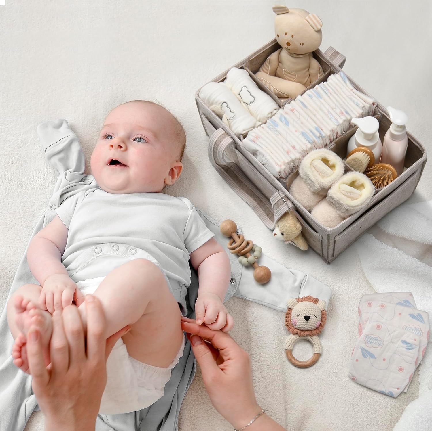 - VERSATILE AND PORTABLE DIAPER CADDY: With multiple compartments, you can easily store all of your baby stuff, baby toys storage, diapers, baby wipes, onesie, burp clothes, changing pads and other baby essentials. You can also use it as car baby organizers and storage