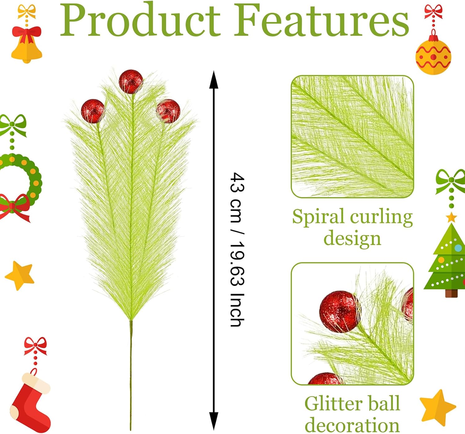- CLASSIC CHRISTMAS DECOR - Lime green Christmas stems paired with red Christmas sparkling balls. Featuring realistic pampas grass texture, furry Christmas stems with sparkling red Christmas balls on top, making your tree full of lively atmosphere.