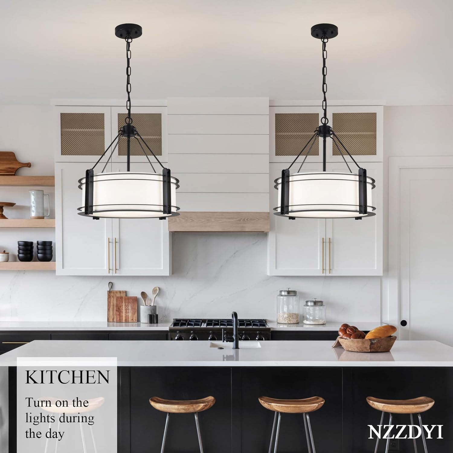 - 【Modern Drum Chandelier】Transform your space with the black farmhouse pendant lights,a sleek fusion of modern and classic styles.Featuring a brushed nickel metal frame and white fabric shade,it casts a gentle,eye-friendly glow.This drum chandelier is Ideal for kitchen island,dining rooms,living room or bedroom,adding a touch of warmth and elegance to any decor