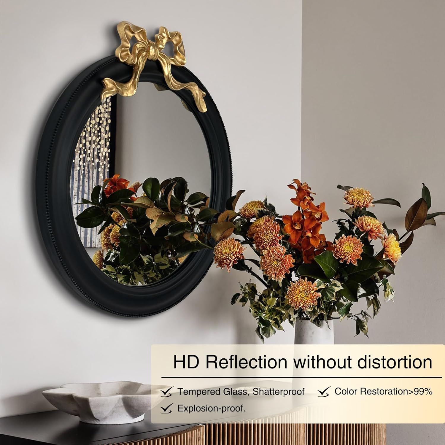 25x25 inch Bow Antique Round Mirror for Wall, Gold & Black Decorative Wall-Mounted Circle Mirror, Perfect for Bedroom, Hallway, Living Room Décor, and Bathroom Vanity