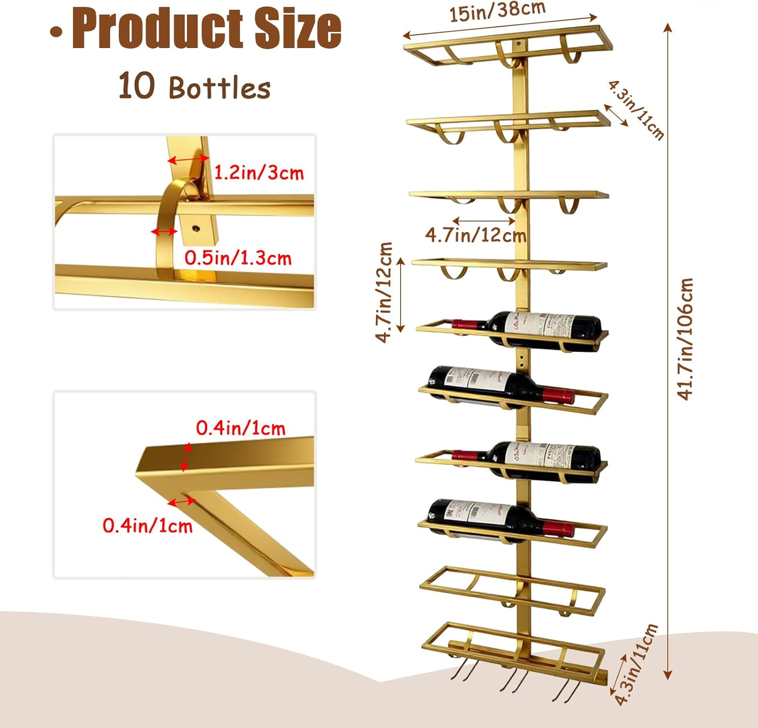 10 Bottle Wall Mount Wine Rack with Wine Glass Holder, Metal Wine Wall Rack, Wall Racks for Wine Bottles Display and Storage, Hanging Bottle Organizer for Living Dining Room Wine Cellar Bar (Gold)