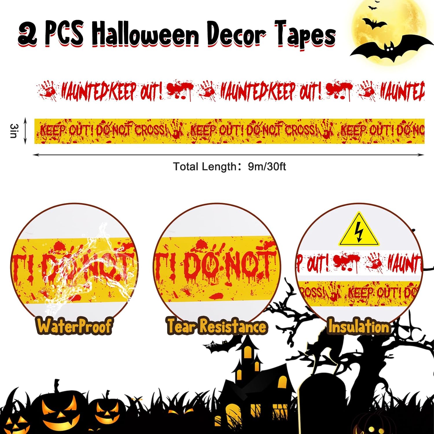- 2 Style Halloween Caution Tapes—Our caution tape roll measures 3in x 30ft and comes in 2 styles. It is made of high-quality polyethylene material, which is waterproof, fade-resistant, and tear-resistant. You can cut the horror tape to the desired length and use it as crime scene tape, for Halloween trick-or-treating paths, Halloween door decorations, or to create a memorable party experience by isolating outdoor horror zones at Halloween parties. Note: Our Halloween warning tape does not have self-adhesive properties