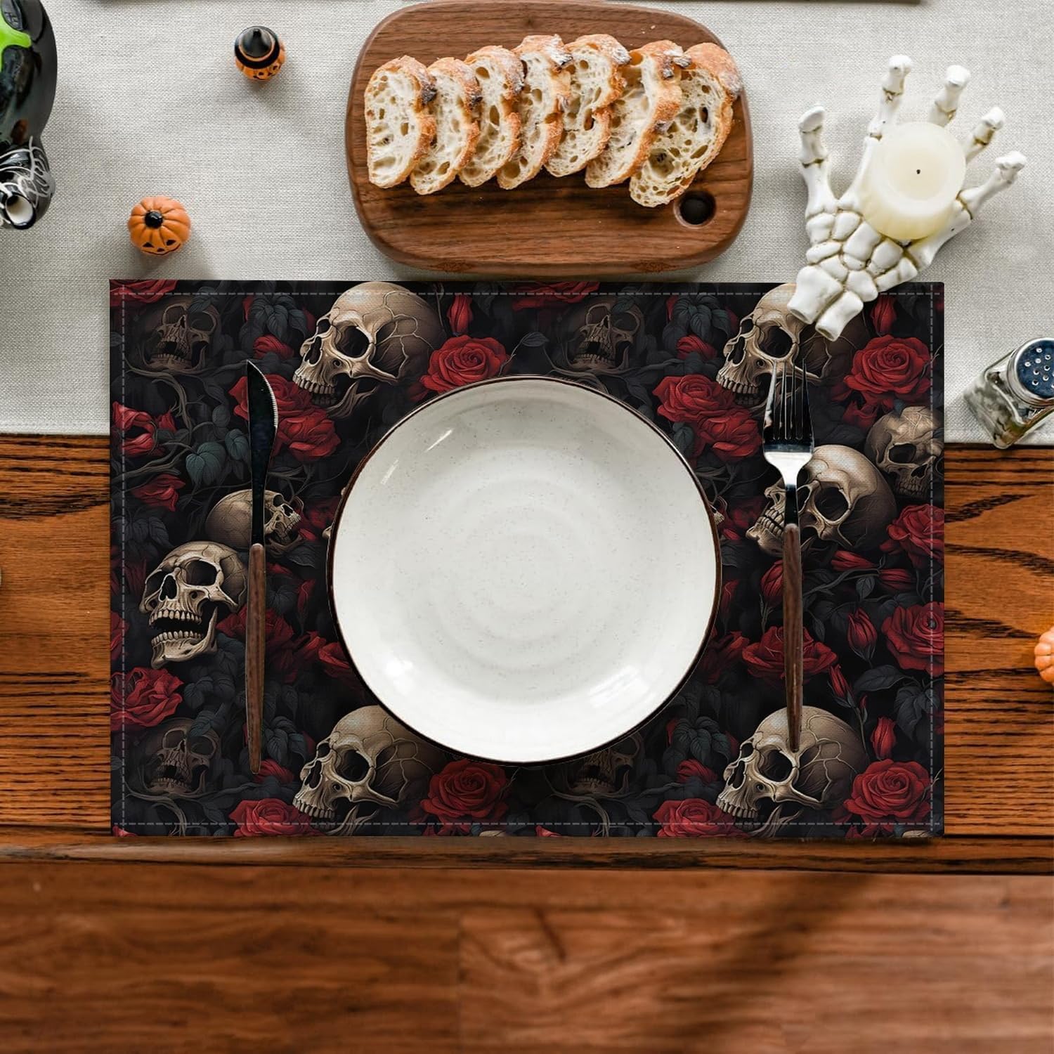 Halloween Skull Rose Placemats, Washable Heat Resistant 12×18 Inch Table Mats Floral Place Mats for Party Outdoor Decoration Kitchen Dining Décor